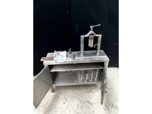 Het verticale schroefmechanisme en de cilindrische container eronder zijn ontworpen voor de productie van kaas of wrongel, geschikt om overtollig vocht eruit te persen.