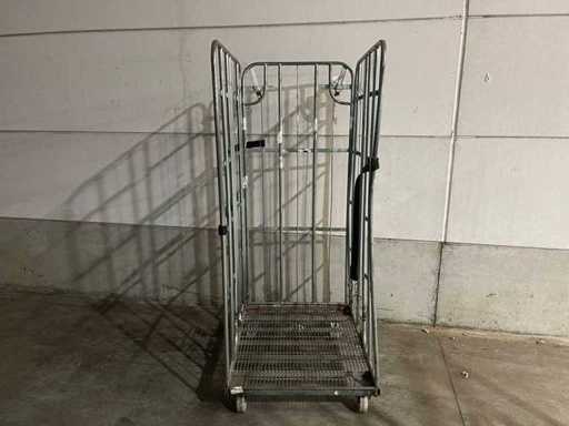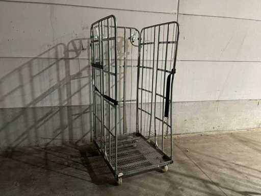 Industriële roll container met drie zijwanden van draadrooster en vier wielen (2 vast, 2 zwenkbaar), ideaal voor logistiek, magazijn, winkel of atelier om goederen, textiel of voorraden mobiel te verplaatsen en veilig te bewaren; de zijwanden voorkomen dat goederen eruit vallen tijdens transport.