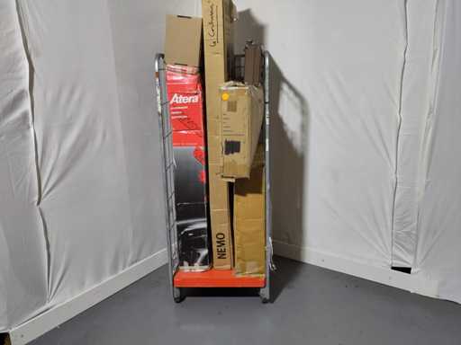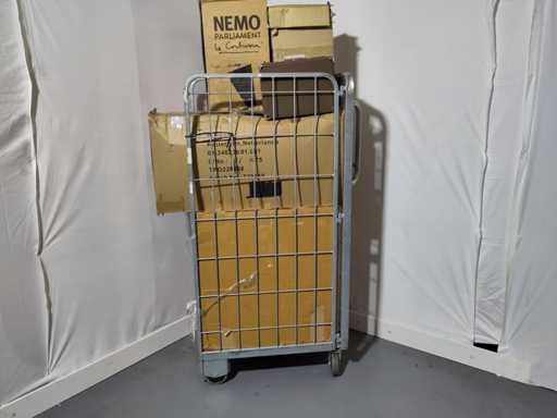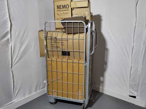 Volle rolcontainer met voornamelijk overstock, overbevindingen, retouren.