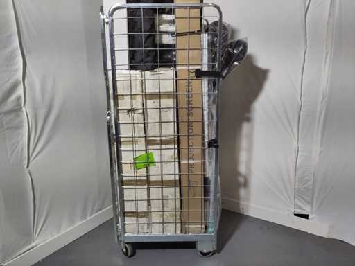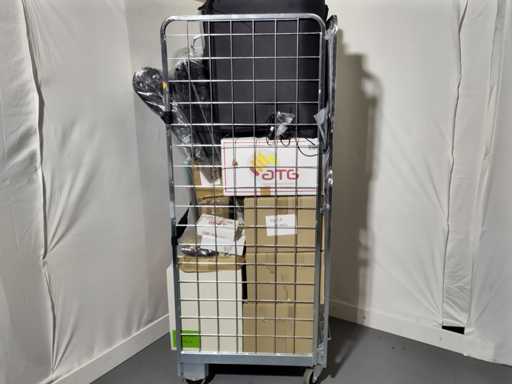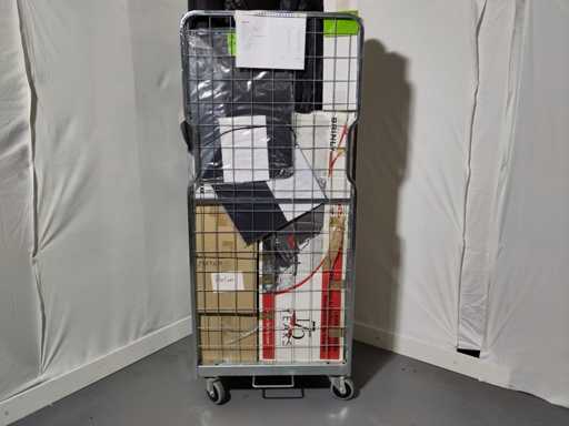 Volle rolcontainer met voornamelijk overstock, overbevindingen, retouren.