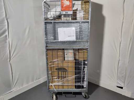 Volle rolcontainer met voornamelijk overstock, overbevindingen, retouren. Rolcontainer niet inbegrepen.