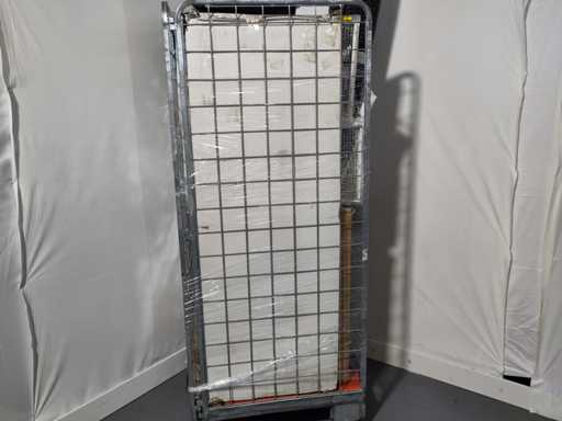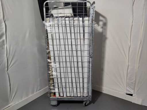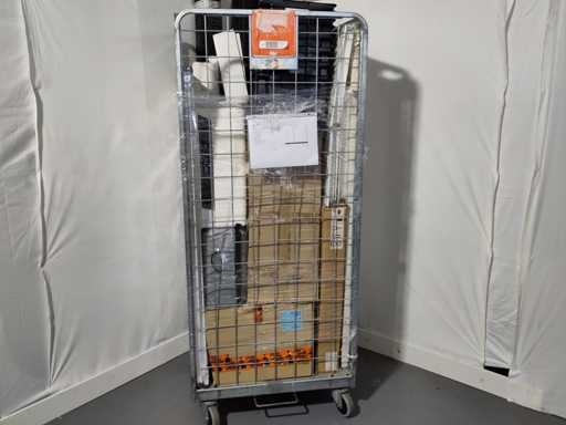Volle rolcontainer met voornamelijk overstock, overbevindingen, retouren. Rolcontainer niet inbegrepen. Inhoud onder andere: - designradiator - luchtreiniger - cowboy schoenen - stelling bakken - klaptafel