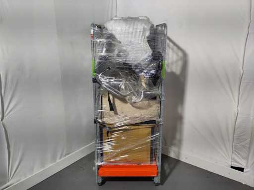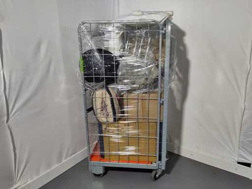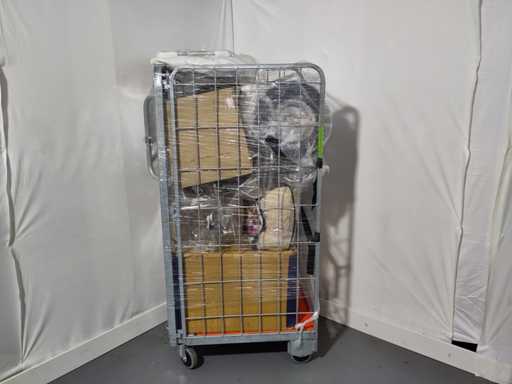 Volle rolcontainer met voornamelijk overstock, overbevindingen, retouren. Rolcontainer niet inbegrepen.