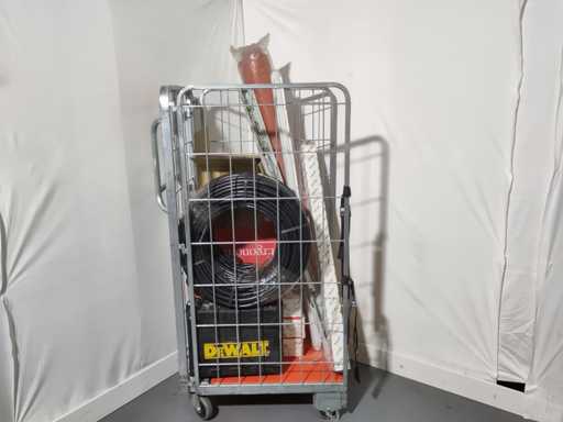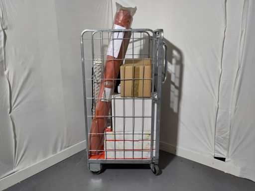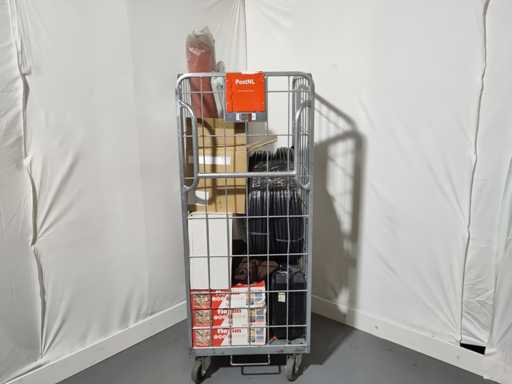 Volle rolcontainer met voornamelijk nieuwe overstock, overbevindingen, retouren. Kar niet inbegrepen.
