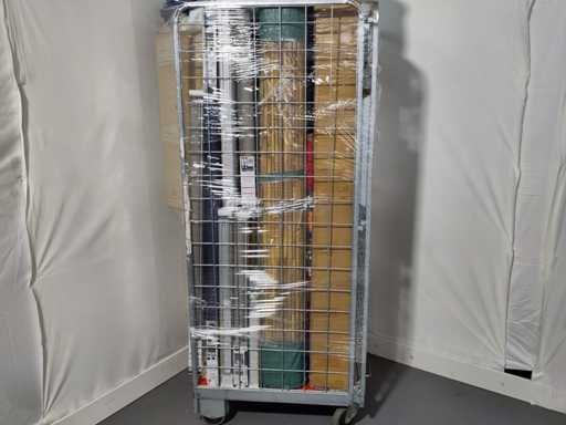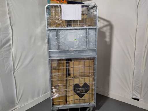 Volle rolcontainer met voornamelijk overstock, overbevindingen, retouren. Rolcontainer niet inbegrepen.