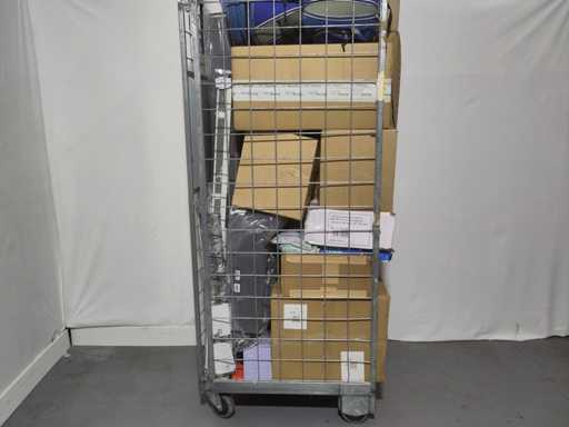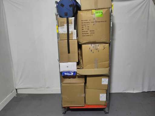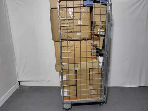 Volle rolcontainer met voornamelijk overstock, overbevindingen, retouren. Rolcontainer niet inbegrepen.
