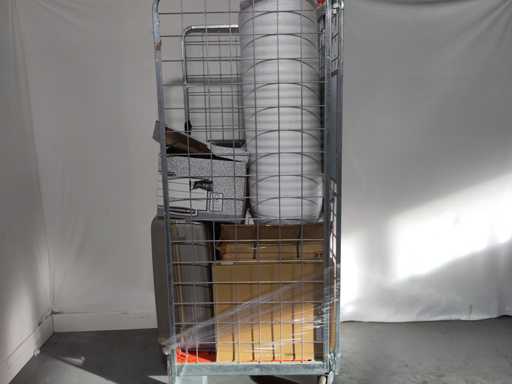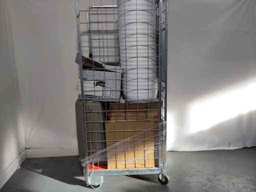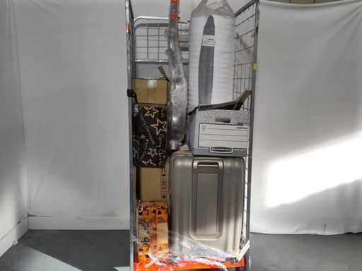 Volle rolcontainer met voornamelijk overstock, overbevindingen, retouren. Rolcontainer niet inbegrepen.