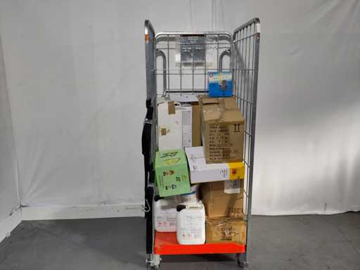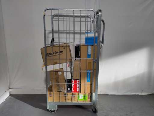 Volle rolcontainer met voornamelijk overstock, overbevindingen, retouren. Rolcontainer niet inbegrepen.