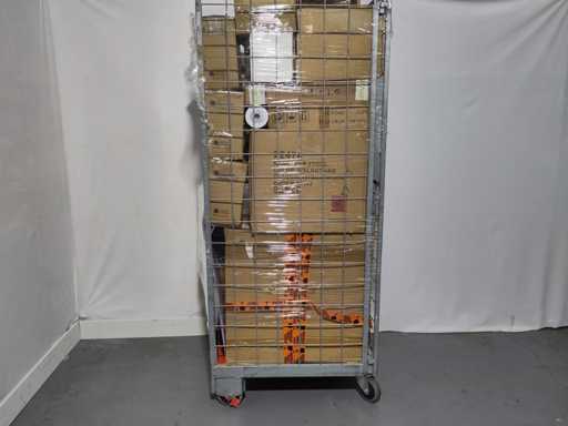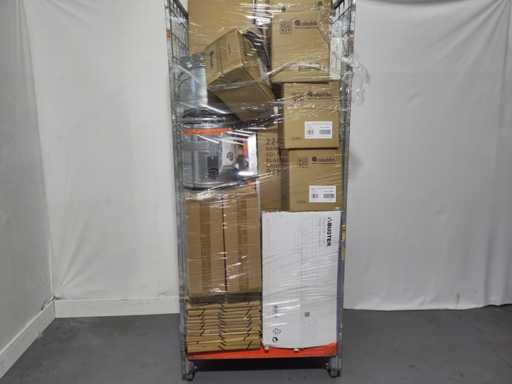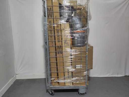 Volle rolcontainer met voornamelijk overstock, overbevindingen, retouren. Rolcontainer niet inbegrepen.