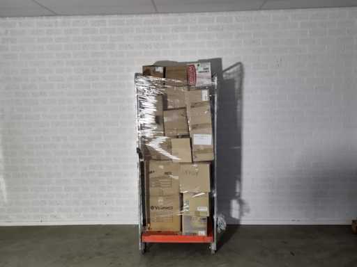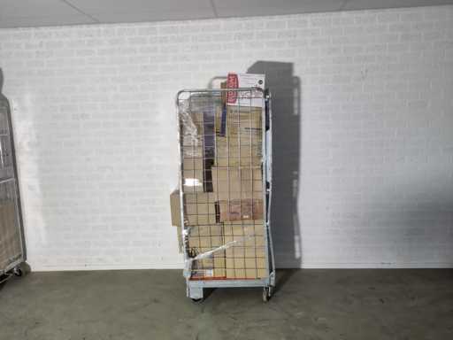 Volle rolcontainer met voornamelijk overstock, overbevindingen, retouren. Rolcontainer niet inbegrepen. Inhoud onder andere: - handschoenen