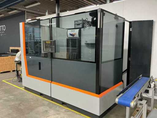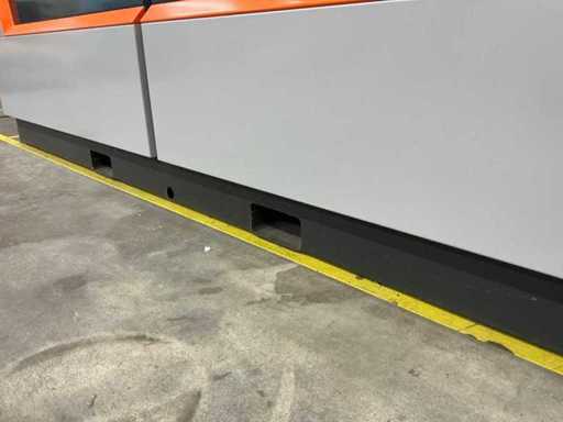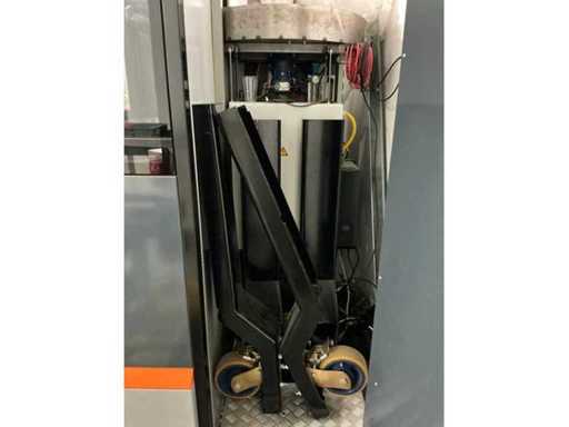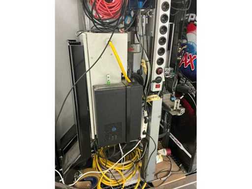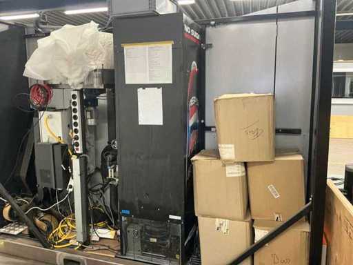 Opstelling ingericht voor de geautomatiseerde verkoop van dranken op evenementen. Voorzien van: koelkast, uitgifte lopende band, professionele verlichting, verkoopschema en transportwielen. Exclusief robot