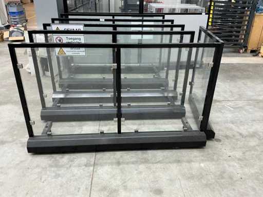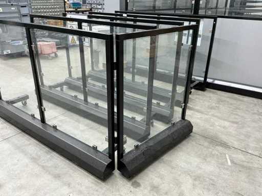 Afmeting per stuk: 200x45x120 cm. Afmeting deur: 100x15x120 cm. De hekken zijn voorzien van glazen wanden, verrijdbaar en koppelbaar