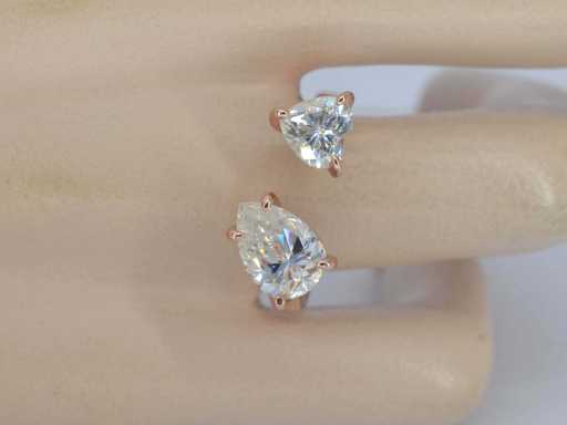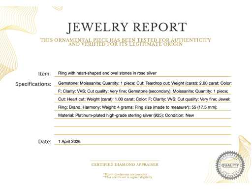 Edelsteen: Moissaniet; Aantal: 1 stuk; Slijpvorm: Druppel vorm geslepen; Gewicht (carat): 2.00 carat; Kleur: F; Zuiverheid: VVS; Slijpkwaliteit: Zeer mooi; Edelsteen (secundair): Moissaniet; Aantal: 1 stuk; Slijpvorm: Hart vorm geslepen; Gewicht (carat): 1.00 carat; Kleur: F; Zuiverheid: VVS; Slijpkwaliteit: Zeer mooi; Juweel: Ring; Merk: Harmony; Gewicht: 4 gram; Ringmaat (op maat gemaakt*): 55 (17,5 mm); Materiaal: Geplatineerd hoog gehalte sterling zilver (925); Conditie: Nieuw; Verpakking: sieradendoos of fluwelen etui; Toelichting: De kwaliteit is overgenomen van het rapport behorend bij item. De waardebepaling is een beoordeling van een gecertificeerde diamantair, gebaseerd op consumentenprijzen.; Consumentenprijs: € 1600,-