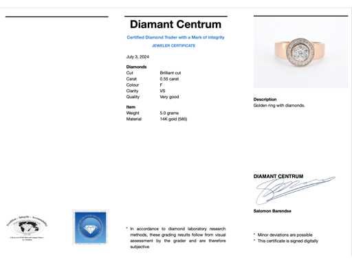 Diamant: Natuurlijk; Aantal: 30 stuks; Slijpvorm: Briljant geslepen; Gewicht (carat): 0.55 carat; Kleur: F; Zuiverheid: VS; Slijpkwaliteit: Zeer mooi; Juweel: Ring; Gewicht: 5 gram; Ringmaat (op maat gemaakt*): 55 (17.5 mm); Materiaal: 14 karaat (585); Conditie: Zo goed als nieuw; Toelichting: De kwaliteit is overgenomen van het rapport behorend bij item. De waardebepaling is een beoordeling van een gecertificeerde diamantair, gebaseerd op consumentenprijzen.; Consumentenprijs: € 4.620,-