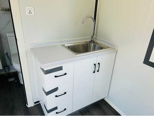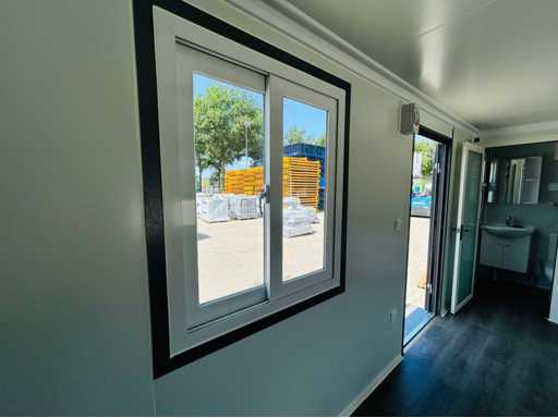 afsluitbare deur; 2 schuiframen; 1 kiep raam; stelbare poten; hijs oog; opstapje; vinyl vloer; wastafel; toilet; douche; keukenbok; geïsoleerd; ventilator; aansluitingen aanwezig voor af- en aanvoer; 7412