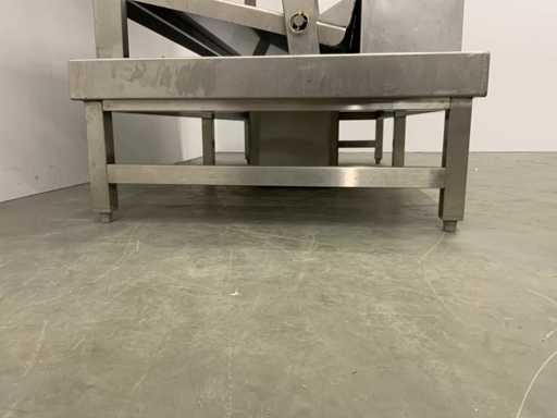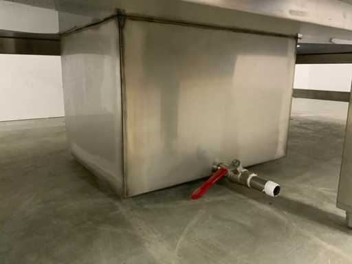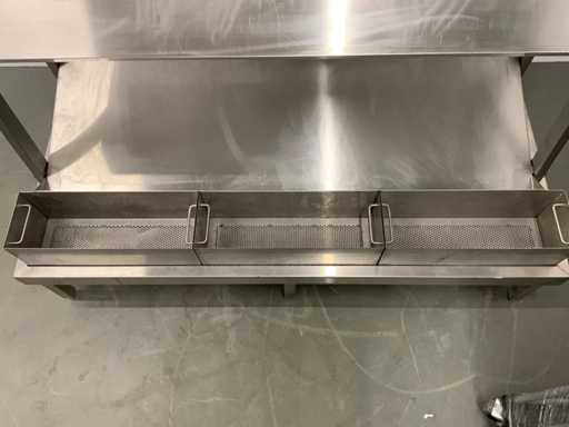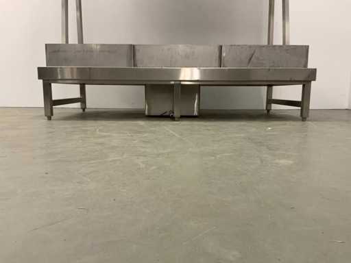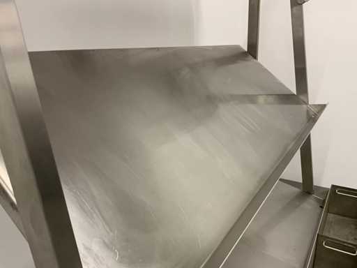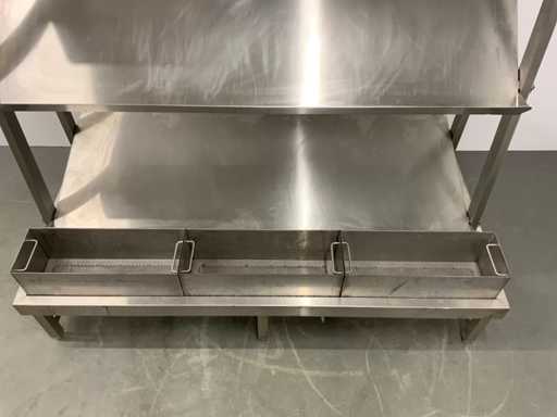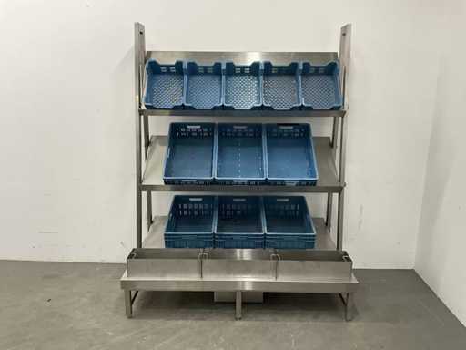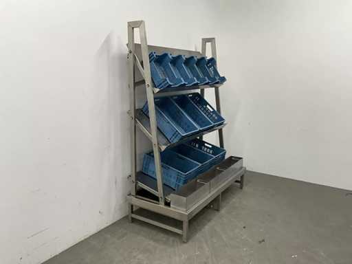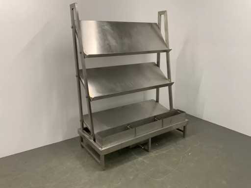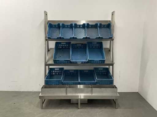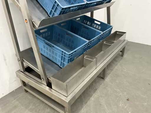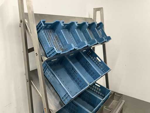 V.v. lekbak met aftapkraan aan onderzijde. Let op! De rekken worden gedemonteerd geleverd, zonder de getoonde rolcontainer. Kratten behoren niet tot de kavel.
