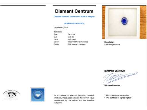 Edelsteen: Saffier; Aantal: 1 stuk; Slijpvorm: Ovaal geslepen; Gewicht (carat): 2.47 carat; Kleur: Saffier blauw (enhanced); Zuiverheid: Met natuurlijke insluitsels; Conditie: Nieuw; Verpakking: Edelsteendoos; Toelichting: De kwaliteit is overgenomen van het rapport behorend bij item.; Consumentenprijs: € 825,-