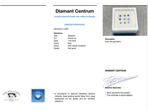 Edelsteen: Saffier; Aantal: 9 stuks; Slijpvorm: Rond geslepen; Gewicht (carat): 1.00 carat; Kleur: Blauw; Zuiverheid: Met natuurlijke insluitsels; Slijpkwaliteit: Very good; Conditie: Nieuw; Verpakking: Edelsteendoos; Toelichting: De kwaliteit is overgenomen van het rapport behorend bij item. De waardebepaling is een beoordeling van een gecertificeerde diamantair, gebaseerd op consumentenprijzen.; Consumentenprijs: € € 880,-