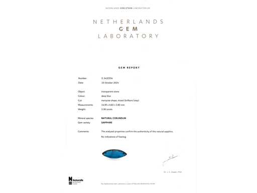 Edelsteen: Saffier; Aantal: 1 stuk; Slijpvorm: Marquise geslepen; Gewicht (carat): 3.38 carat; Kleur: Diep blauw; Zuiverheid: Met natuurlijke insluitsels; Certificaat: NEL; Certificaat nummer: E2420354; Conditie: Nieuw; Verpakking: Edelsteendoos; Toelichting: De kwaliteit is overgenomen van het rapport behorend bij item. De waardebepaling is een beoordeling van een gecertificeerde diamantair, gebaseerd op consumentenprijzen.; Extra informatie: Minder dan 1% van alle saffieren zijn onverhit. Deze saffier is onverhit.; Consumentenprijs: € 47.960,-