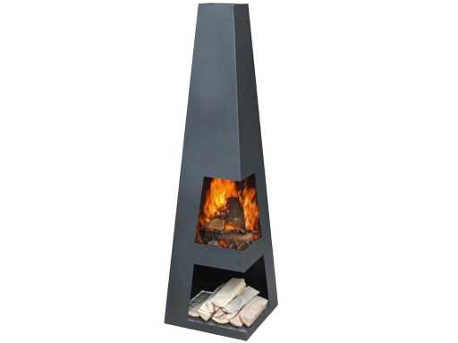 moderne en sfeervolle tuinhaard met een hoogte van 125 cm; hoogwaardig en robuust plaatmateriaal gecoat en van 1,6mm dik staal en volledig gelaste constructie; exclusief hout; verpakt in een stevige kartonnen doos.