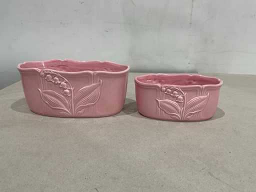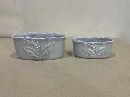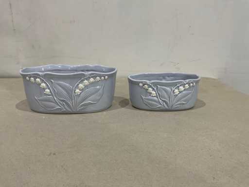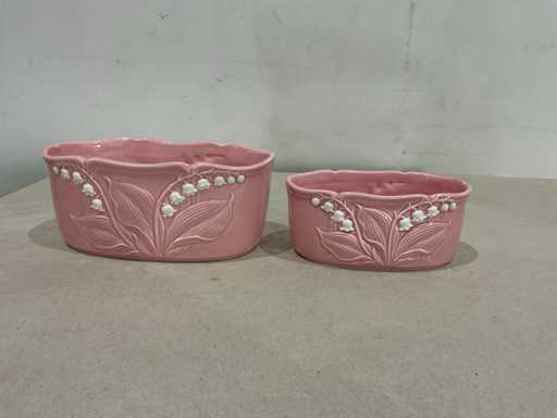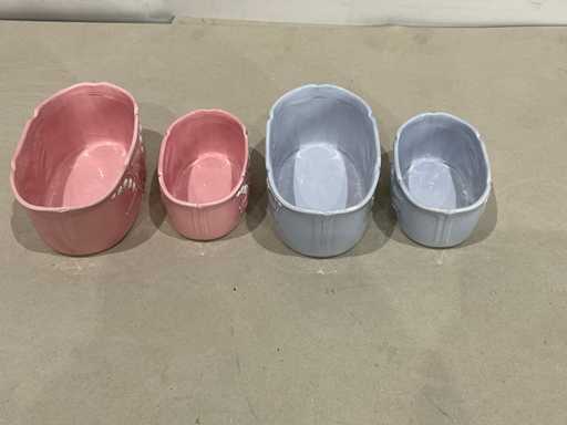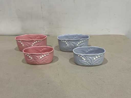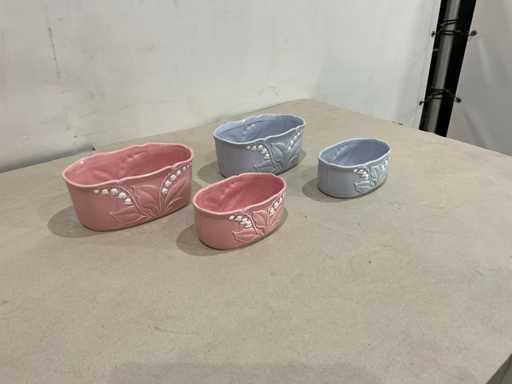 kavel bestaat uit 25 dozen; per doos 2 schaaltjes; 1x circa 16 cm lang; 10 cm breed; 7 cm hoog; 1 x circa 21 cm lang; 12,5 cm breed; 9 cm hoog