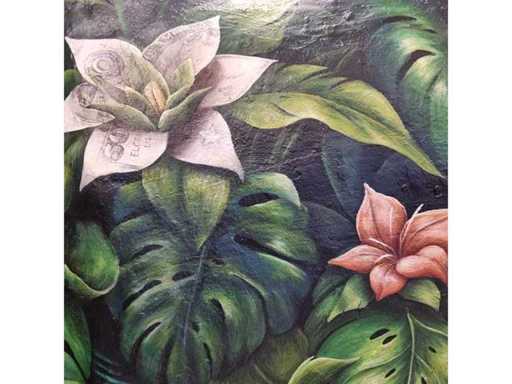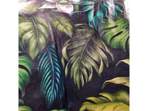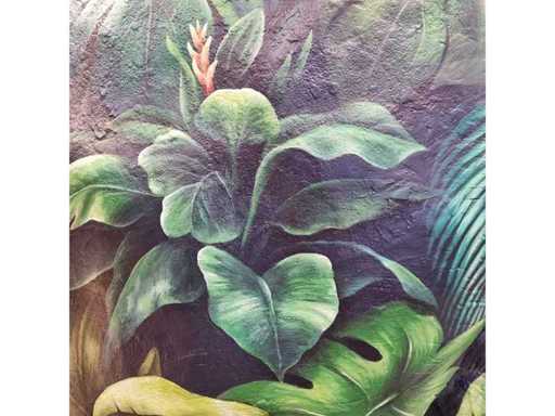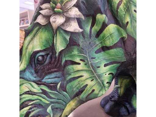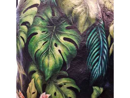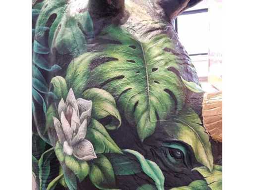 Het beeld is uitgevoerd in een rijk botanisch thema met tropische bladeren en bloemen die over het lichaam van de neushoorn vloeien. De gelaagdheid, penseelstructuur en kleurwerking geven het sculptuur diepte en levendigheid vanuit iedere kijkhoek.