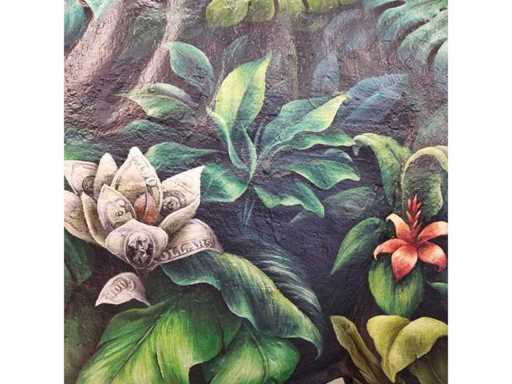 In de bloemdetails zijn patronen van dollarbiljetten verwerkt — een artistiek statement over de economische drijfveren achter stroperij. Daarmee is dit werk niet alleen visueel indrukwekkend, maar ook inhoudelijk geladen: een ode aan een bedreigde diersoort en een oproep tot bewustwording.