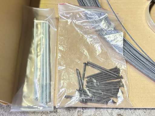 De lengte van een rechte buis is 61 cm met een diameter van 9 cm. 2 bochten van 45 graden, 4 metalen klemmen, staalkabel en overig montagemateriaal. Nieuw in doos.