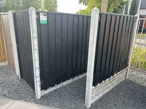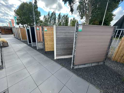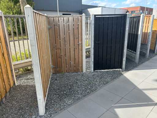 11st. Showmodel houtbeton schutting. Bestaande uit sets van 2 palen; 1 onderplaat; 1 tuinscherm; inclusief 2 tuindeuren op een stalen deurframe met ingebouwd cilinderslot. Alle schuttingen dienen ordelijk en netjes gedemonteerd te worden door koper.