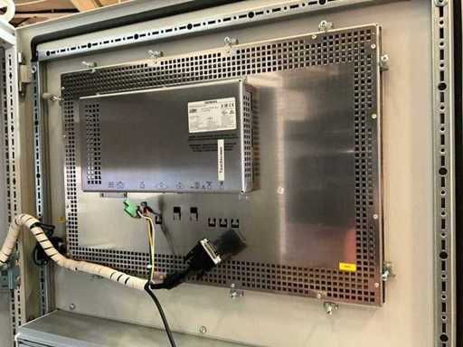 Siemens SIMATIC HMI-pakket bestaande uit Industrial Flat Panel IFP2200 Multitouch, 22" (6AV7 863-4MA00-0AA0), ATEX/IECEx-goedgekeurd frontpaneel, IP65 front, 24 V DC, Full-HD 1920×1080, capacitieve multitouch, en Siemens SIMATIC Microbox PC (IPC-serie, besturingskastontwerp) als besturings-/visualisatiecomputer; Gebruikte apparatuur uit de industriële productie,