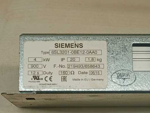 Siemens SINAMICS Power Module 340 industriële aandrijfmodule met geïntegreerde remmodule. Ingangsspanning 380–480 V, 50/60 Hz, nominale ingangsstroom 10,2 A. Inclusief remweerstandmodule type 6SL3201-0BE12-0AA0, met een vermogen van 4 kW, 900 V. Geschikt voor CNC- en industriële aandrijfsystemen.