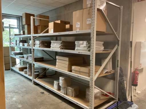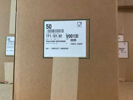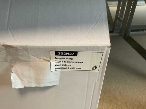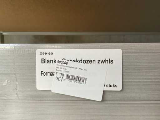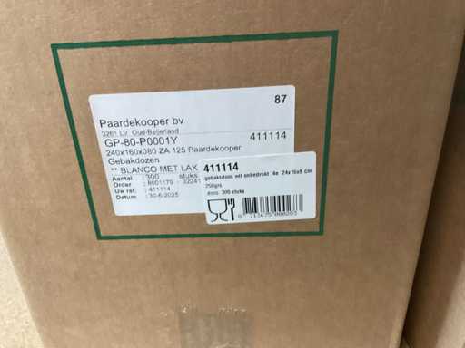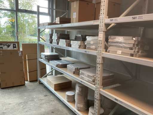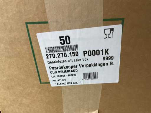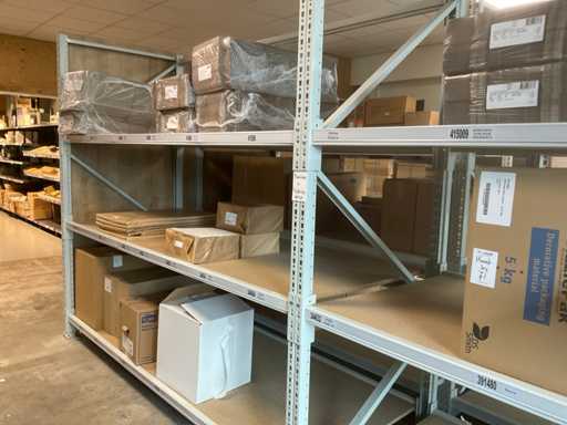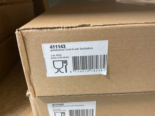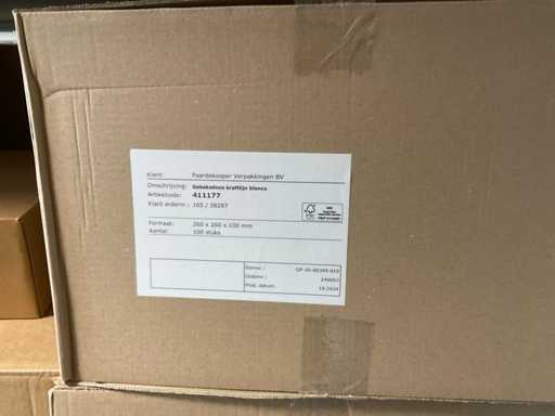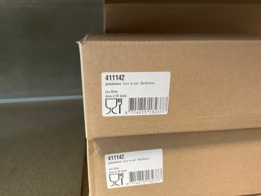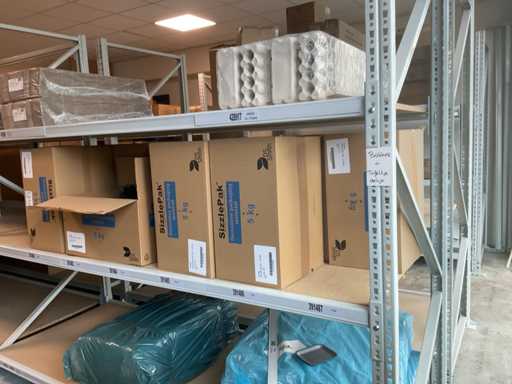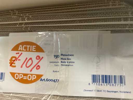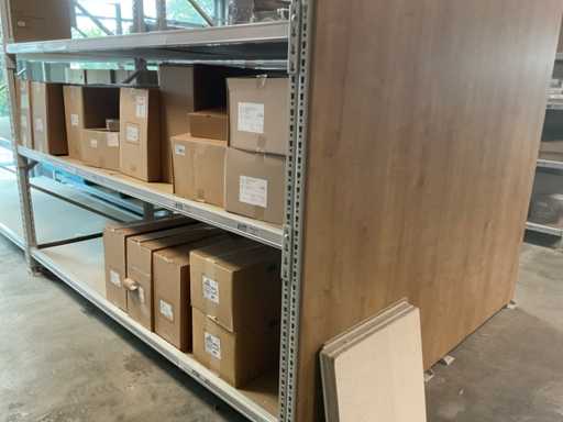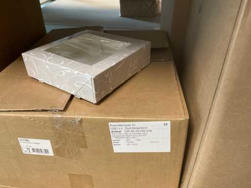 Inhoud 2,5 stellingdelen bestaande uit o.a. chocolade letterdozen, taart/gebaksdozen, pizzadozen, decoratief verpakkingsmateriaal, vellen, servet dispenser, etc, exclusief stellingen