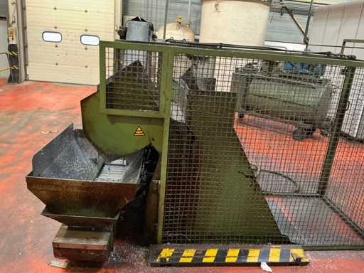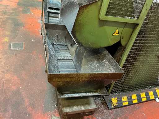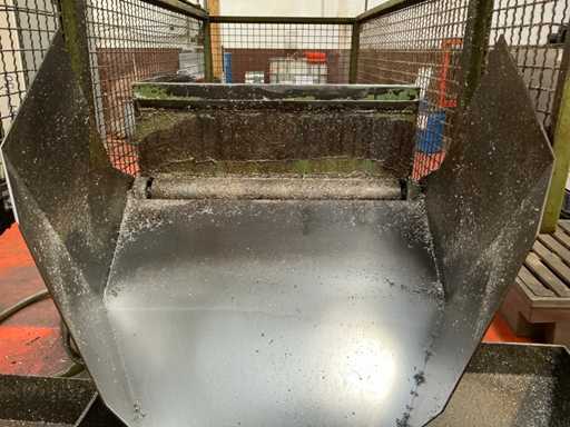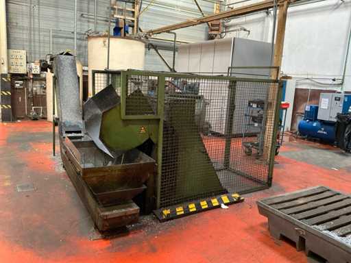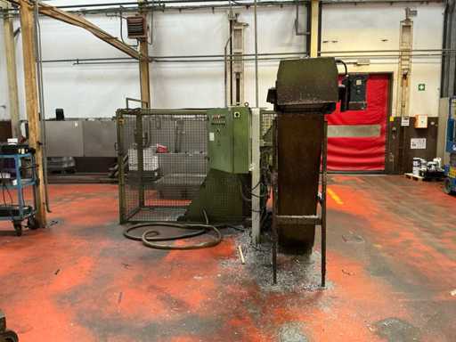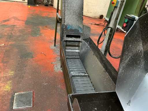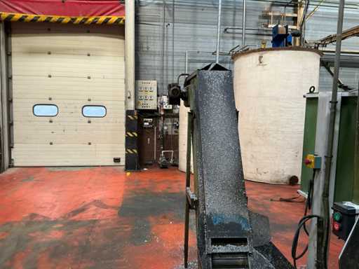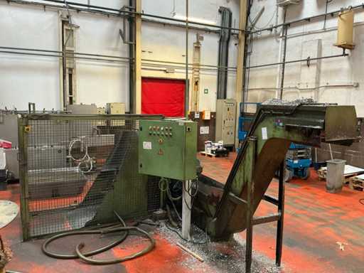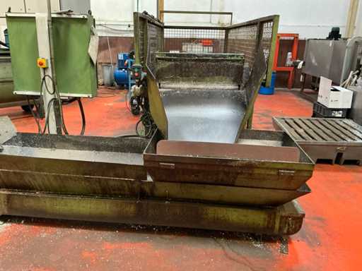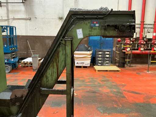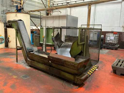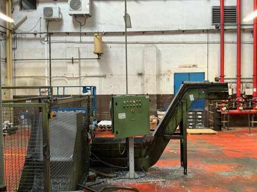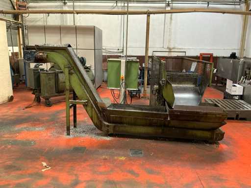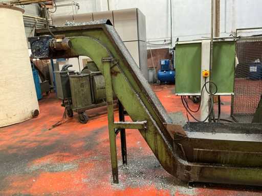 Kavel bestaande uit een metaalspanentransporteur met een gemotoriseerd systeem en geïntegreerd elektrisch paneel, ontworpen voor de afvoer van metaalafval en koelmiddel in industriële bewerkingsprocessen.