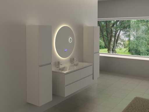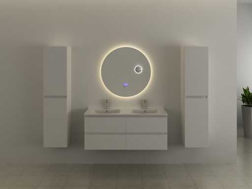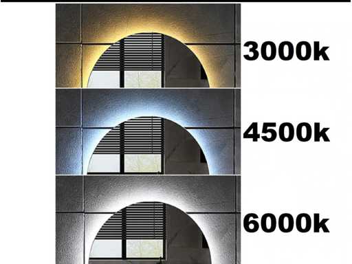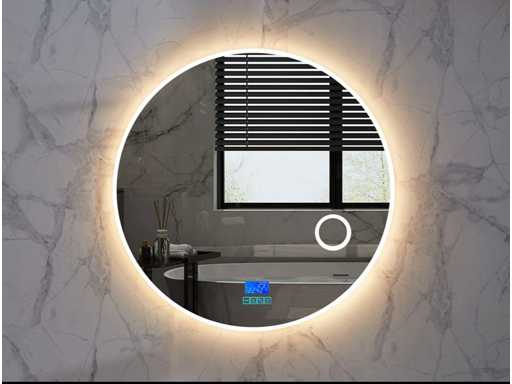 Type: RNLM-80 Model: Ronde spiegel met LED verlichting Afmetingen: Ø80 cm, dikte: 0,5 cm Kleur: LED verlichting in 3 kleuren; geel, blauw en wit Voorzien van: Touch bediening via digitaal display – LED verlichting in 3 kleuren, dimbaar – Bluetooth & speakers – Digitale klok – Digitale temperatuurmeter – 220 volt aansluiting – Anti-fog technologie door verwarming in de spiegel – Vergrootglas (vergroot 3x) in de spiegel Ø10 cm - Kopervrije spiegel - 1,5mm explosieveilige laag aan de achterkant.