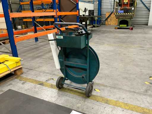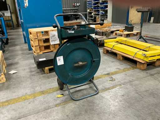verrijdbare haspel inclusief aangebroken rol staalband; inclusief handbediend hefboom Cyclop staalband omsnoerapparaat;