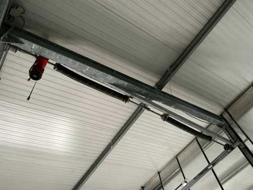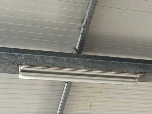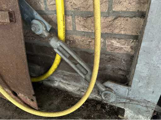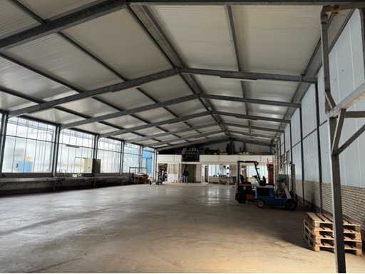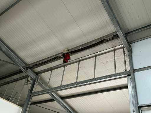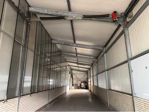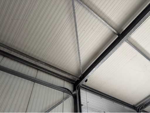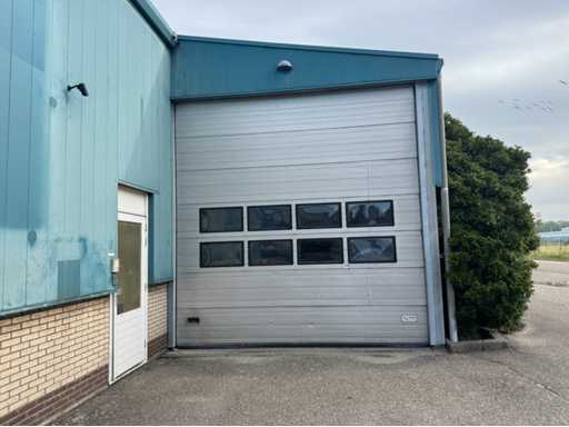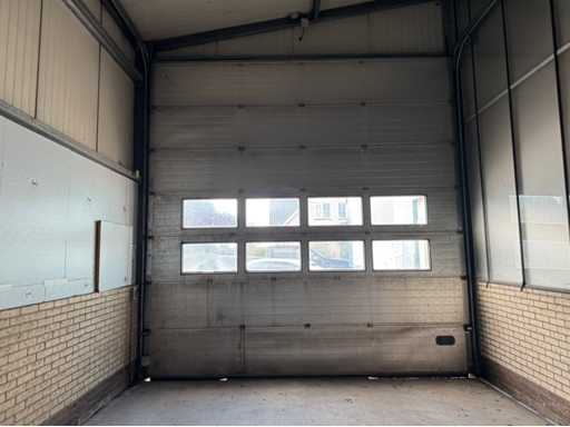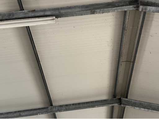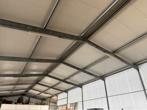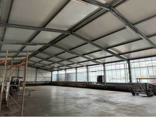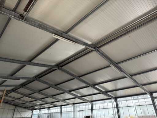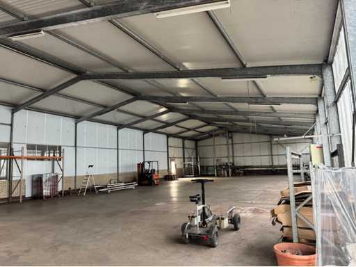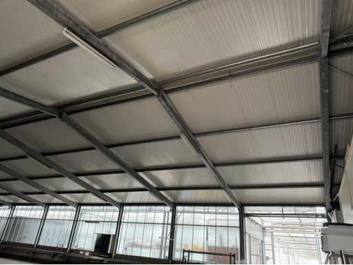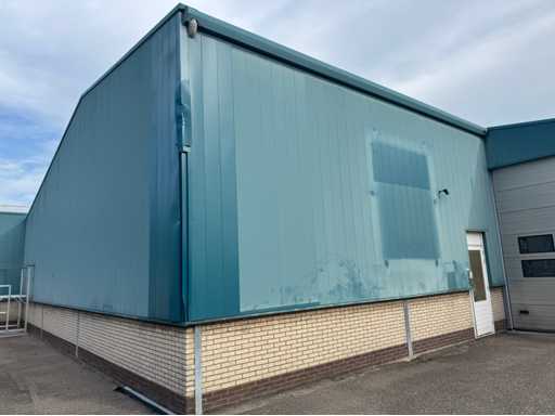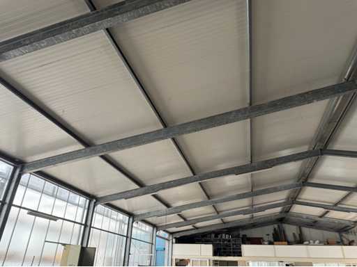 Vrije overspanning van 16000 mm; totale constructie lengte 40840 mm; met gedeelte van tussen gevel tot buitengevel “aanbouw gedeelte” van ca. 4400 mm breed en 31500 mm lang; vakmaat 4000 mm; goothoogte 4550 mm; nokhoogte 6450 mm; 1 zijde van de constructie zijn spantbenen IPE 300; staanders IPE 300; andere zijde spantbenen IPE 240; staanders IPE 160; tussen staanders voor tussen gevel IPE 160; kopgevel constructie spantbenen en staanders IPE 160; dak en gevels van stalen gordingen; dak en gevels met schoren en windverbanden; dak met drukkokers; dak helemaal van sandwichpanelen; gevels gedeeltelijk geïsoleerd; 2 overheaddeuren van 4250 mm breed en 4320 mm hoog; wordt gedemonteerd en transport klaar gemaakt door verkoper;