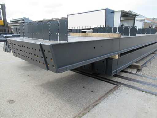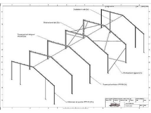 vrije overspanning; spanten h.o.h. 5000mm; dakhelling 15 graden; 4 sets tussenspanten IPE200; 2 sets kopgevelspanten IPE140 met windstijlen; staaltekening; 3D-tekening; voorzien van drukkokers; windverbanden; gordinglippen op de spanten; kavel ligt netjes transportklaar en dient met 1 trailer opgehaald te worden; kavel wordt gratis met een heftruck geladen
