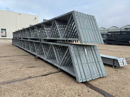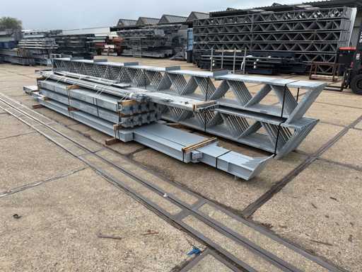 Overspanning trekstang tussen de spanten; spanten h.o.h. 4000mm; bestaande uit 9 sets traliespanten met kokers als staanders; 2 sets eindspanten met windstijlen IPE140; dakhelling 25 graden; voorzien van trekstangen met ophangstrips; windverbanden en kruisschoren; kavel ligt netjes transportklaar en dient met 1 trailer opgehaald te worden; kavel wordt gratis met een heftruck geladen