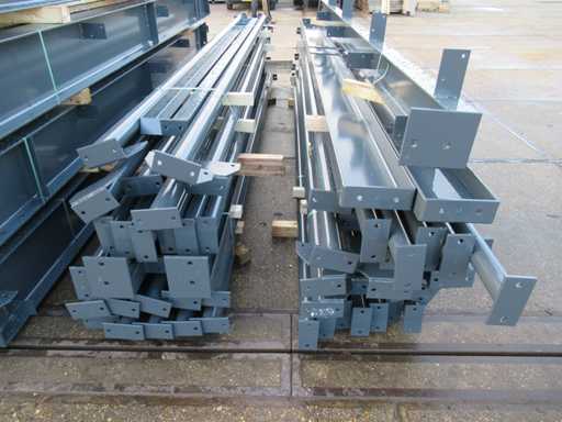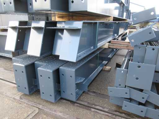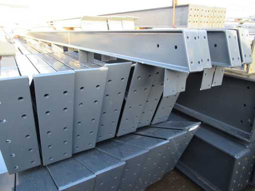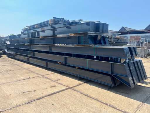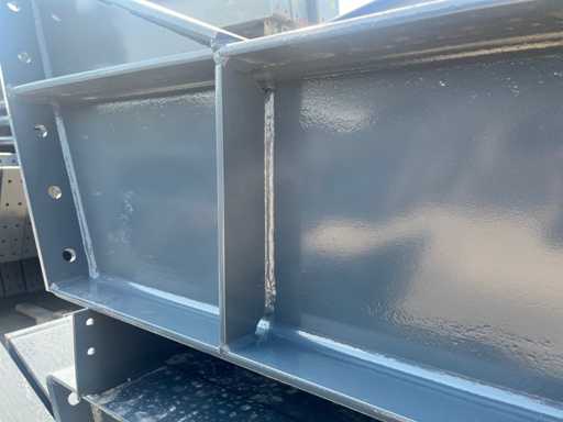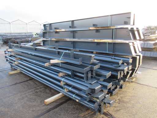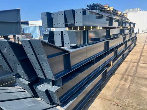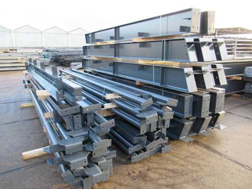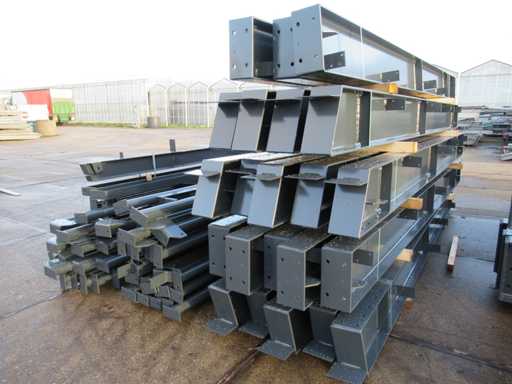 Nederlandse productie; vrije overspanning; spanten h.o.h. 5000mm; staalberekeningen; staaltekeningen; montagetekeningen; ankerplan; staal genummerd volgens montageplan; dakhelling 20 graden; 11 sets tussenspanten IPE360/300; 2 sets eindspanten IPE 200/180 met windstijlen waarvan 1 set voorzien is van een deursparing; voorzien van drukkokers; windverbanden; gordinglippen; bouten en moeren; meestort ankers; staalconstructie volgens productnorm EN1090 (Certificaat na aankoop verkrijgbaar); kavel ligt netjes transportklaar en dient met 2 trailers opgehaald te worden; kavel wordt gratis met een heftruck geladen