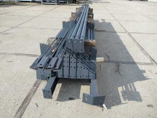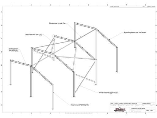 vrije overspanning; spanten h.o.h. 4000mm; dakhelling 15 graden; 2sets tussenspanten IPE160; 2 sets kopgevelspanten IPE140 met windstijlen; staaltekening; 3D-tekening; voorzien van drukkokers; windverbanden; gordinglippen op de spanten; kavel ligt netjes transportklaar en dient met 1 trailer opgehaald te worden; kavel wordt gratis met een heftruck geladen