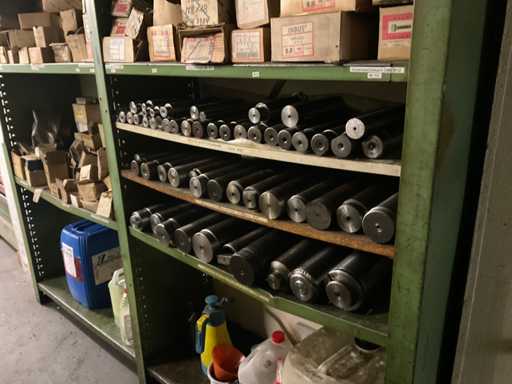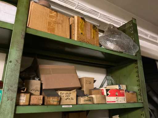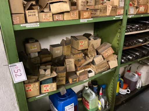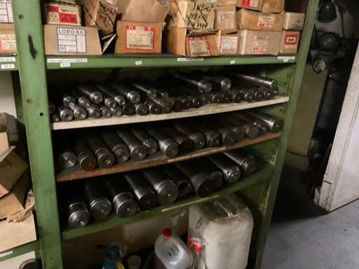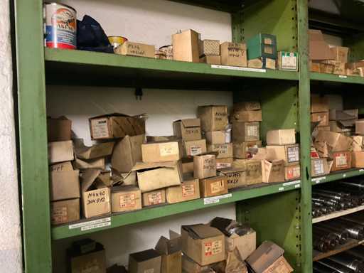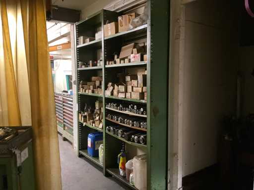 Stalen plank zonder bouten met inhoud, bestaande uit: bijvoorbeeld verschillende schroeven, diverse cilindrische pennen, diverse slijpmalrels