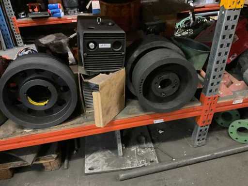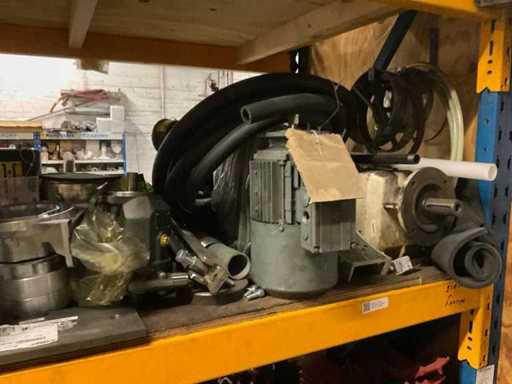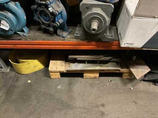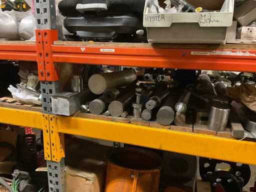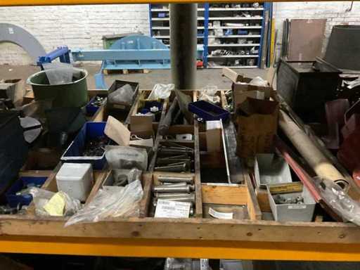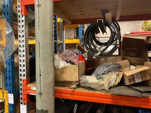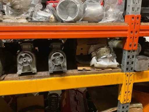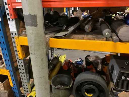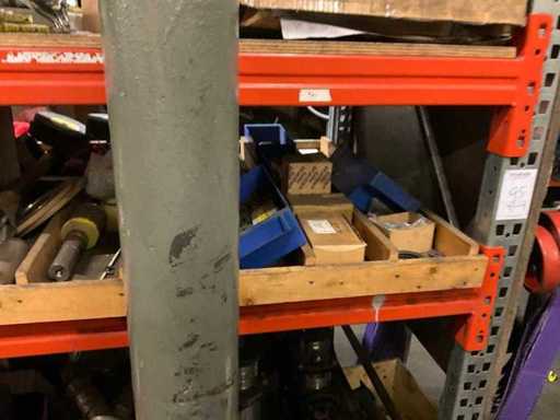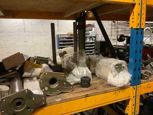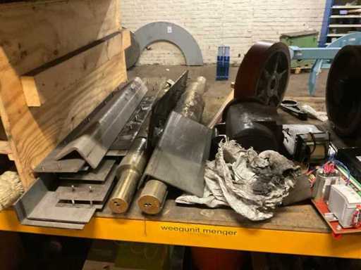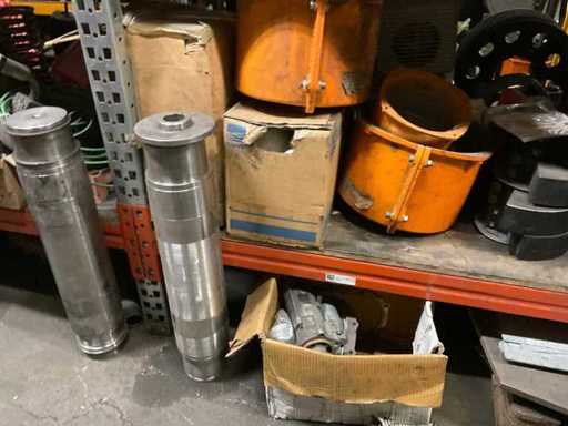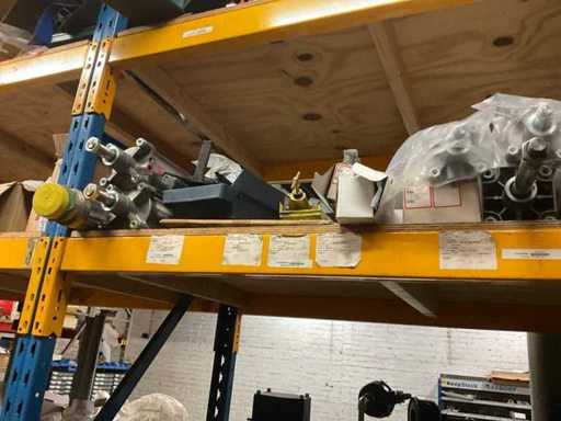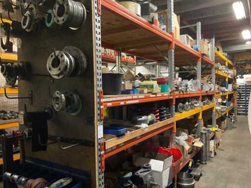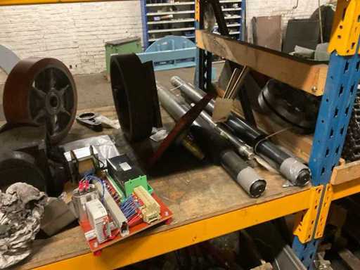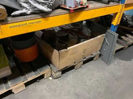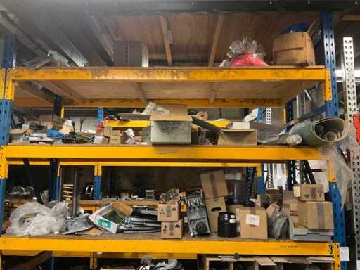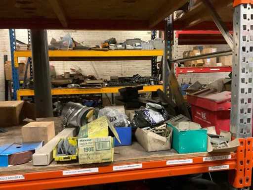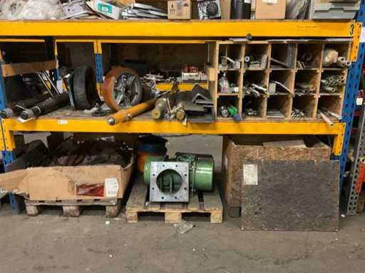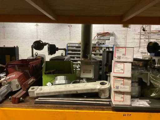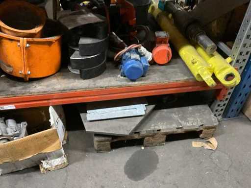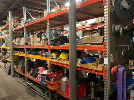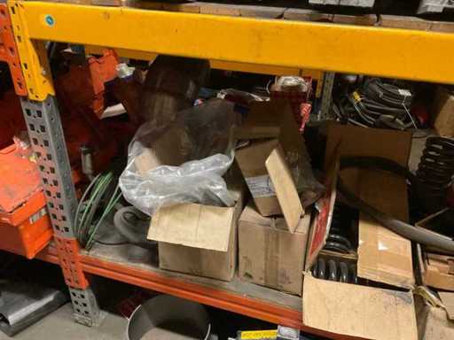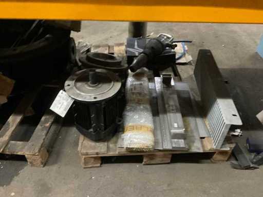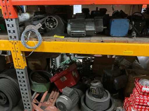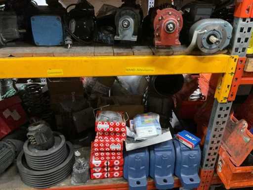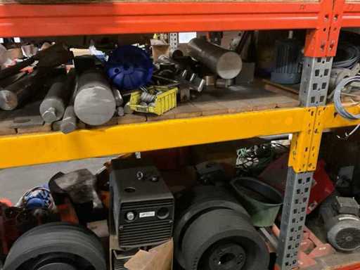 5 secties palletstelling met inhoud, bestaande uit o.a. onderdelen en toebehoren voor machines w.o. Cilinders, motoren, elektronika,stafmateriaal, pompen, veren, schuurbanden, lagers, poulies, in en inclusief palletstelling.