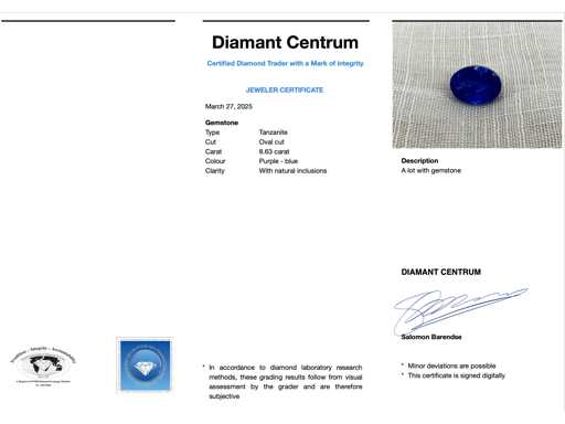 Edelsteen: Tanzaniet; Aantal: 1 stuk; Slijpvorm: Ovaal geslepen; Gewicht (carat): 8.63 carat; Kleur: Paars - blauw; Zuiverheid: Met natuurlijk insluitsels; Conditie: Nieuw; Verpakking: Edelsteendoos; Toelichting: De kwaliteit is overgenomen van het rapport behorend bij item. De waardebepaling is een beoordeling van een gecertificeerde diamantair, gebaseerd op consumentenprijzen.; Consumentenprijs: € 3.520,-