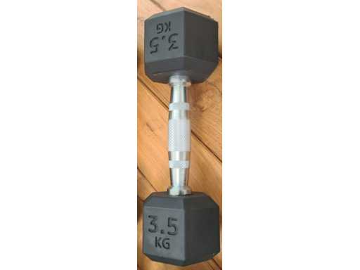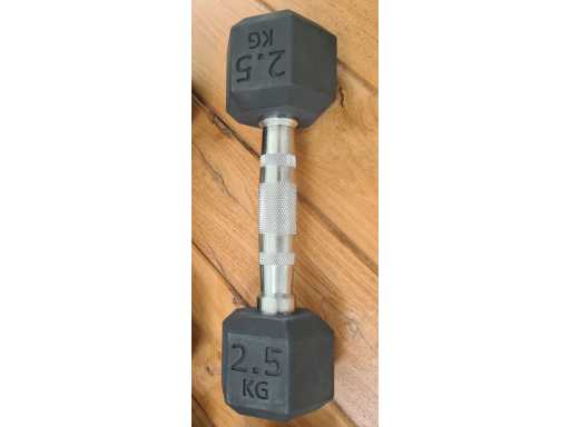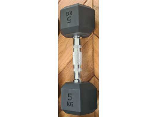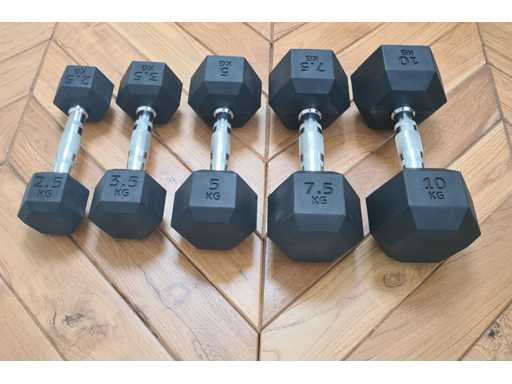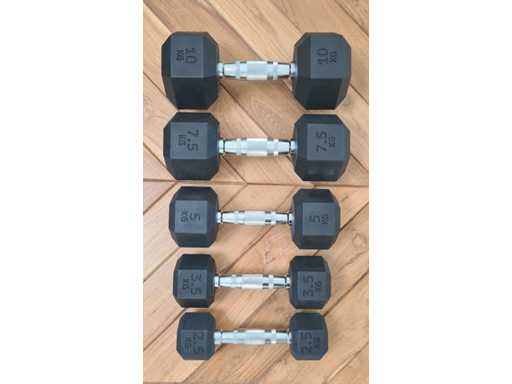 60 sets van elk vijf professionele zeshoekige dumbbells (kg 2,5 - 3,5 - 5 - 7,5 - 10). Ontworpen voor kracht- en functionele vrijlichaamstraining. De vorm van het handvat en het knullontwerp zorgen voor een stevige en stevige greep, zelfs bij de moeilijkste bewegingen. De vorm en materialen van de zeshoekige bekleding zorgen voor stabiliteit en grip bij vloeroefeningen. Het chroombehandelde constructieve stalen handvat weerstaat impact en oxidatie. De dikke 5 mm rubberen coating absorbeert schokken en beschermt oppervlakken. Dankzij hun vorm rollen de zeshoekige dumbbells niet over de vloer en kunnen ze op elk vlak oppervlak worden geplaatst. De reliëf- en contrasterende getallen helpen bij het selecteren en snel veranderen van gewichten.