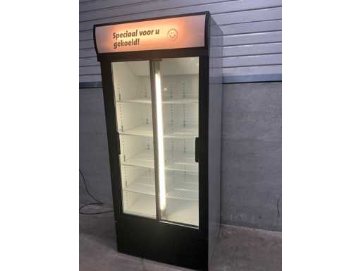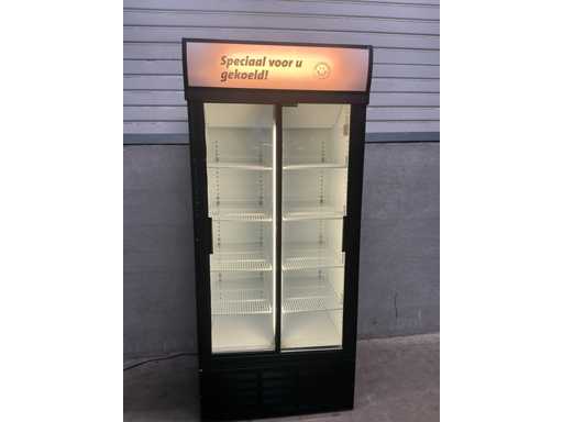 Glasdeuerkoelkast voorzien van 2 schuifdeuren in hoogte verstelbare roosters