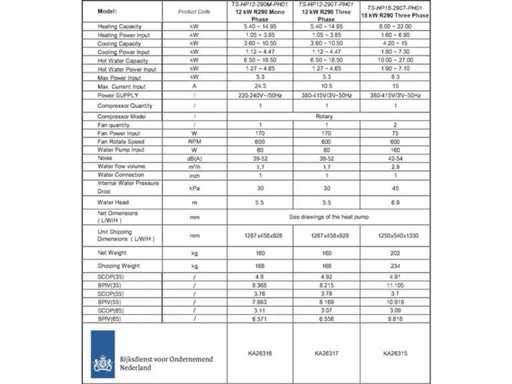 Serienummer: B092309130187. Dit betreft een verpakte unit. R290 refrigerant gas Energy Class: A++++ Heating + Cooling + Hot Water Full DC inverter compressor and fan motor Max outlet temperature: 70 O Wifi smart control Inverter water pump inside Modbus RS485 Full DC Inverter Technology