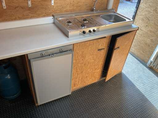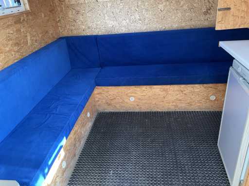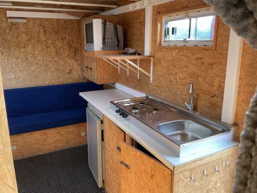 Woonkamer met zetelbank( onder de zetels opbergruimte ) , wasbak, fornuis op gas , tv , frigo ( werkt op 3 standen 12V, 220V of Gas).