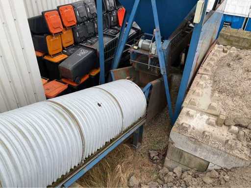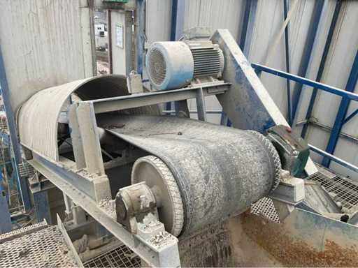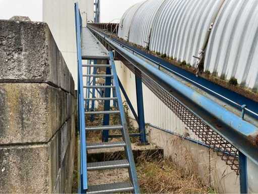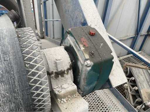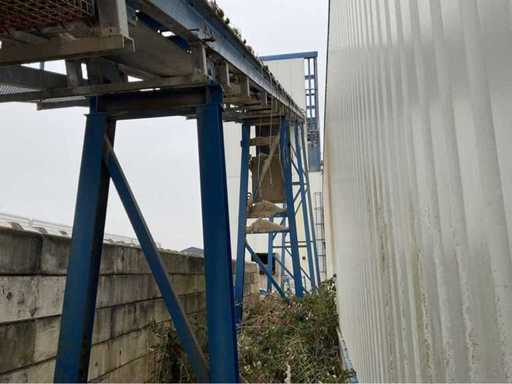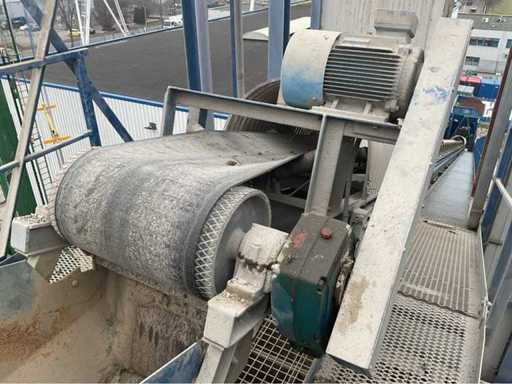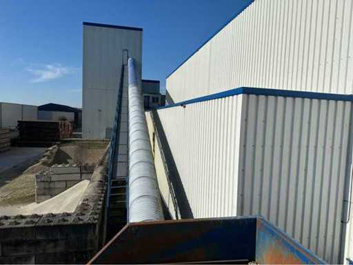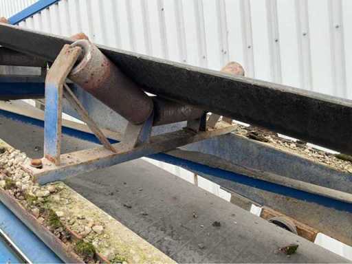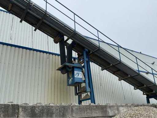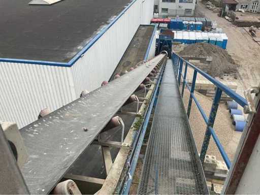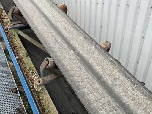 opvoerhoogte 14,5 meter; met loopbordes; lengte 42 meter; band breedte 63cm; motor 18,5 kw; band is gedemonteerd en transport klaar; gedemonteerd stukken 12 meter; wordt geladen.