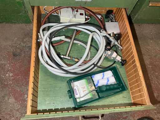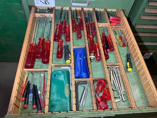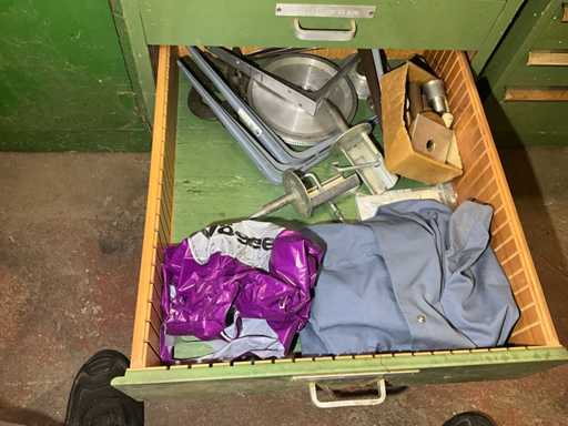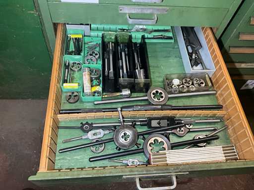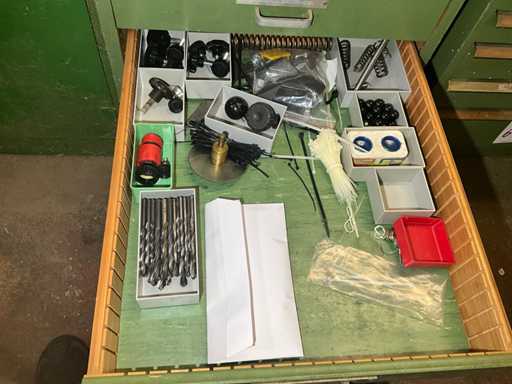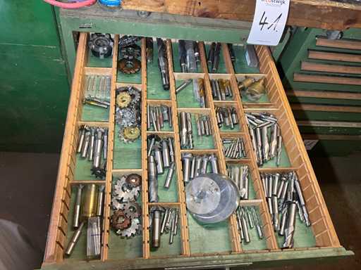 Met 6 lades, inhoud van de frees, draadsnijmateriaal, gereedschap en diversen, sleutel ontbreekt, gewicht geschat op ca. 100 kg, hoeveelheid en verdere details zie foto's