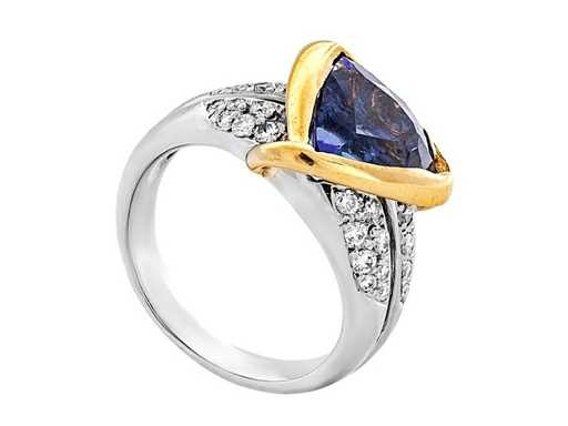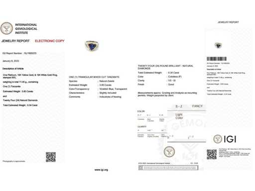 Uniek luxe ontwerp ring Intense violetachtig blauw Natuurlijke Tanzaniet 4,19 karaat in 18 karaat wit/geel goud en platina 900 11,46 gr met een natuurlijke blauwviolette tanzaniet in driehoekige vorm 3,85 karaat, 24 ronde briljante natuurlijke diamanten F-G / SI van 0,34 karaat. Gecertificeerd door IGI, een van 's werelds grootste onafhankelijke edelsteencertificerings- en taxatieinstituten. Meer informatie zie het certificaat. De sieraden zijn in werkelijkheid beter dan de foto's. Winkelprijs: € 11.950.-
